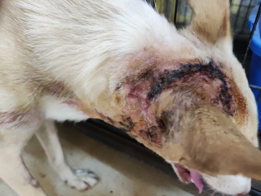 Die Wunde wurde sehr gut gereinigt; zum Glück waren keine Würmer in der Wunde, obwohl es eine alte Wunde war und die Haut wie scalpiert ihren kleinen Kopf freilegte. Der Tierarzt hat die Wunde mit 15 Stichen genäht.